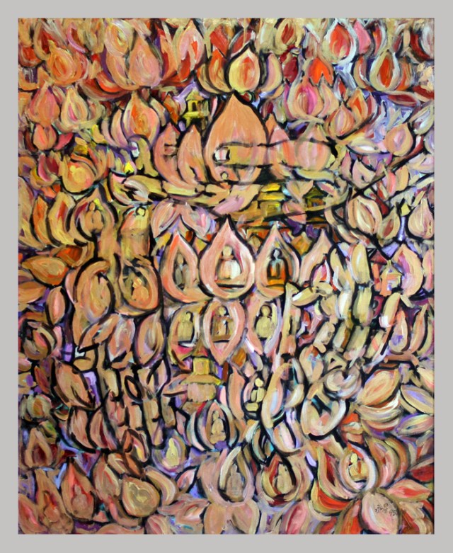 我於返家後即將此幻境描繪在畫布上,並將三個手印隱於構圖之中,此畫作因緣既是由此而來。