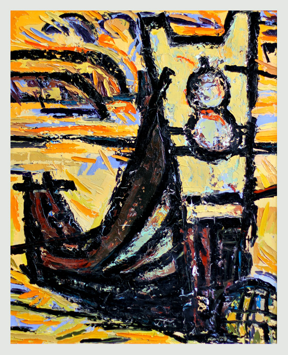 談起九份;想起早期和前輩畫家廖正輝,在基隆港碼頭認識的經過,那時我在港區面對基隆的運河道(如今只剩一條),用粉彩忘情似的塗鴉,約略過了四十分鐘,才發現身後站著一位相當瀟灑的壯年人,一身磨損卻乾淨的藍灰卡奇衣褲,還戴著一頂蘇格蘭尼毛料鴉舌帽,他對我說:「畫的很專心嘛,能借我看看嗎?」我尚未點頭,他就將畫搶過,看了約莫五分鐘,回過頭對我說:「你外表太斯文了和畫風不一樣!」接著說:「要不要看看我的畫?如果有興趣,你在這裡等我,我繞一下港區就提早下班,到我住的地方看看畫。」看著他翻過泊船頭,沒一會兒時間快艇已經駛出港外。(這一年我十九歲)