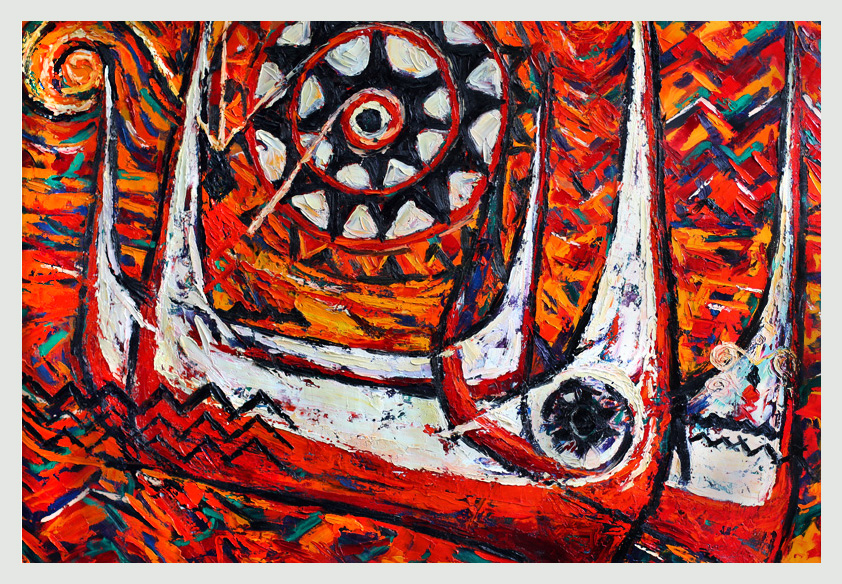 無畏感動、慾望、激情、貪念、嗔癡總是全力堆疊著色彩,然後用些黑地線條將它圈起,令其似人或物,為情、寫意都在黑的線段框架中構築成立。如果散去了這些框架線條,色塊就彷若去了聚合成形的緣,在其有限的畫幅範圍內佇候,等待觀者給予新的詮釋,造就新的緣份,此時作者的意志與情感已然成為一個念、一個因。果在觀者。