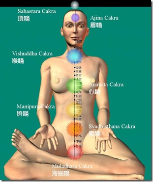 七大部位叢集(Cakras),Cakras各部位的運作刺激著腺體的分泌,經此產生許多不同的荷爾蒙並影響身體各器官的運作,當功能正常分泌平衡時是表示身心的健康,反之過多、過少的分泌便是身心的病徵。