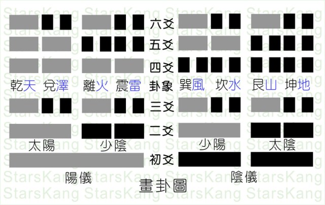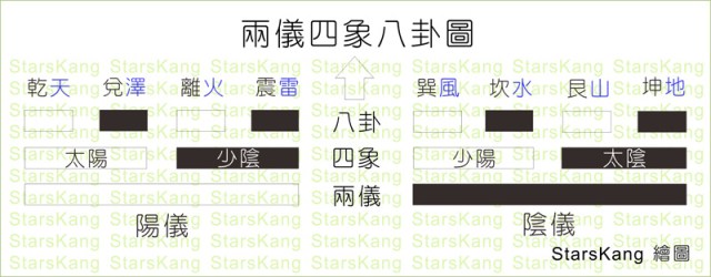 易有太極,是生兩儀,兩儀生四象,四象生八卦。《繫辭上》