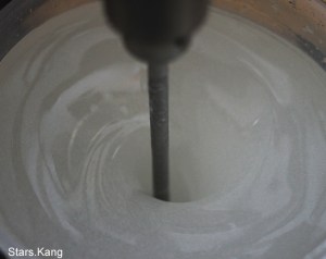 4.皂化持續進行中,於稠度聚增或是黏度上揚時將所餘的精油全部添加。