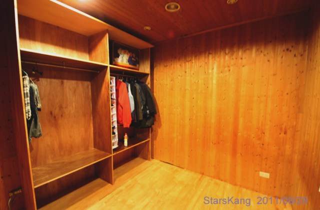 上圖是經兩星期的六、日所完成的衣櫥框架(241*240cm)及原木密接契口地板,衣櫥門板的吊軌及牆面與地板的接線板都還未到貨。