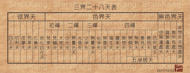 界天,略分為四禪天,細分為十八天。初禪有三天──梵眾,梵輔,大梵。這雖沒有男女的差別,但還有君臣人民的國家形態。二禪有三天──少光,無量光,光音;三禪有三天──少淨,無量淨,遍淨;四禪有九天──無雲,福生,廣果,無想,無煩,無熱,善現,善見,色究竟天。二禪以上,都是離群獨居的;世界就是自己的宮殿,不像人間有一共同的器世界。此上是「無色界」:這是連物質(色)的身體與住處都沒有,僅有心識,眾生就為這心心法而繫著。由於沒有物質,不佔空間,所以不能說在那裏。但依禪定(生天的因業)來說,這是比色界四禪更高上的。無色界也有四天──空無邊處,識無邊處,無所有處,非想非非想處天。三界諸天,共有二十八。