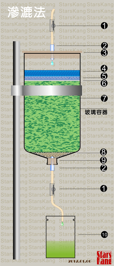 (二)將預作浸泡香料材分次放入主玻璃容器並用(磁、木棒)施力加以壓實,依次蓋上項6.、項5.然後加入溶劑(約淹過高於項5.(10mm)劑量)。