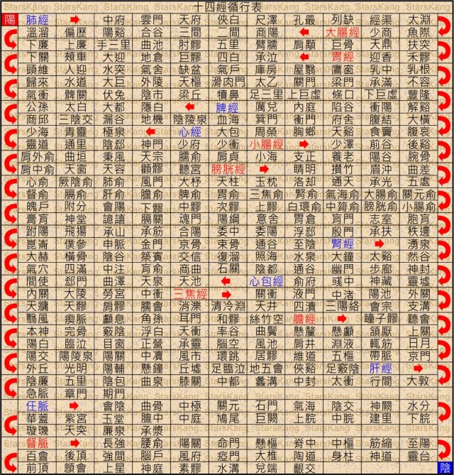 手太陰肺經●手陽明大腸經○足陽明胃經○足太陰脾經●手少陰心經●手太陽小腸經○足太陽膀胱經○足少陰腎經●手厥陰心包絡經●手少陽三焦經○足少陽膽經○足厥陰肝經●任脈●督脈○ StarsKang製表(如果需要較佳的圖表顯示,請點選圖表,進入後再點選一次圖後放大即可)