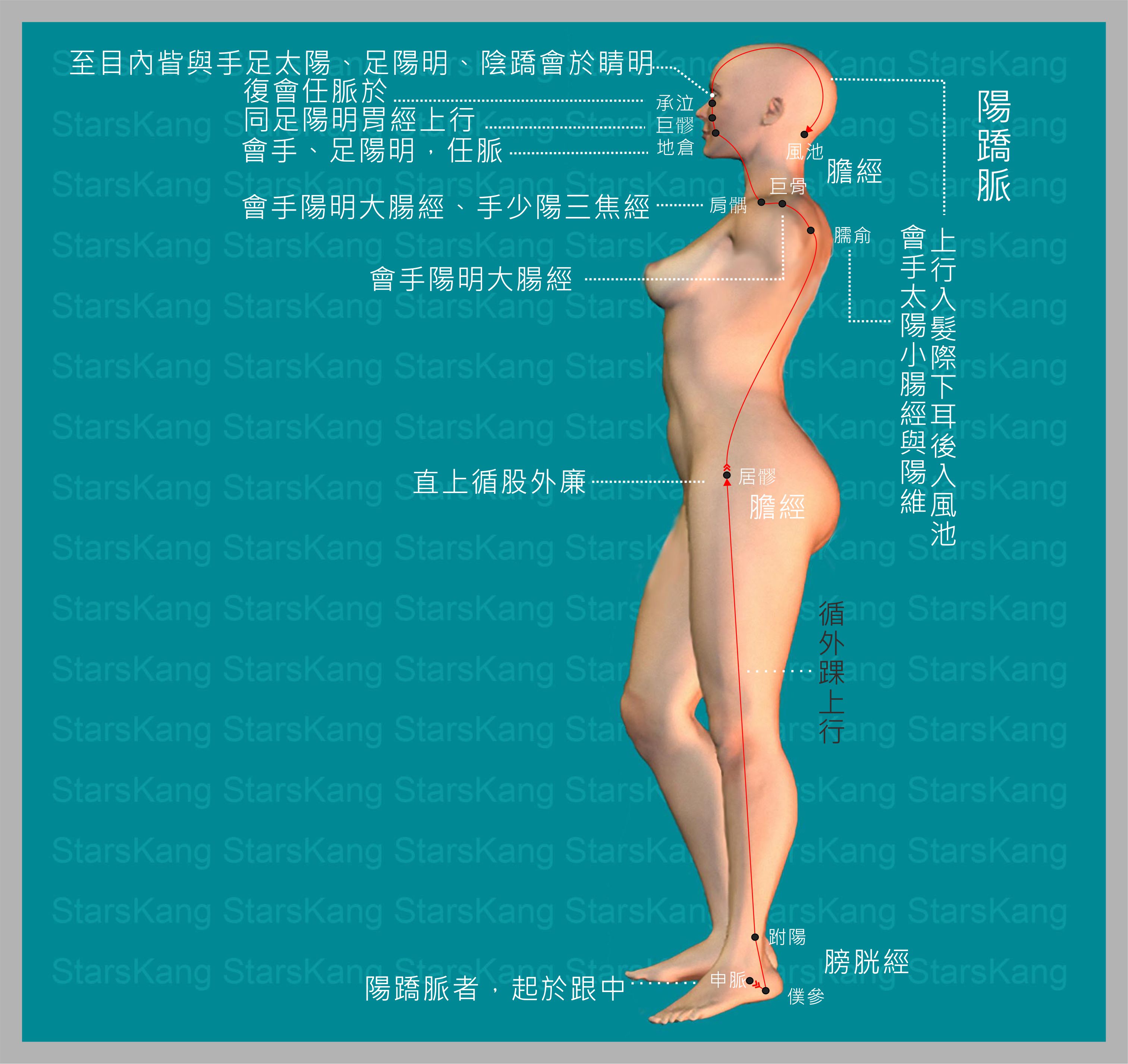陽蹻脈者,足太陽之別脈,其脈起於跟中,出於外踝下足太陽申脈穴,當踝後 遶跟以僕叅為本。上外踝上三寸以附陽為郄,直上循股外廉,循脇後胛上,會手太陽陽維於臑俞,上行肩髆外廉會手陽明於巨骨,會手陽明、少陽於肩髃,上人迎夾口吻,會手足陽明、任脈於地倉,同足陽明上而行巨窌,復會任脈於承泣,至目內眥與手足太陽、足陽明、陰蹻五脈會於睛明穴,從睛明上行入髮 際,下耳後入風池而終,凡二十二穴。